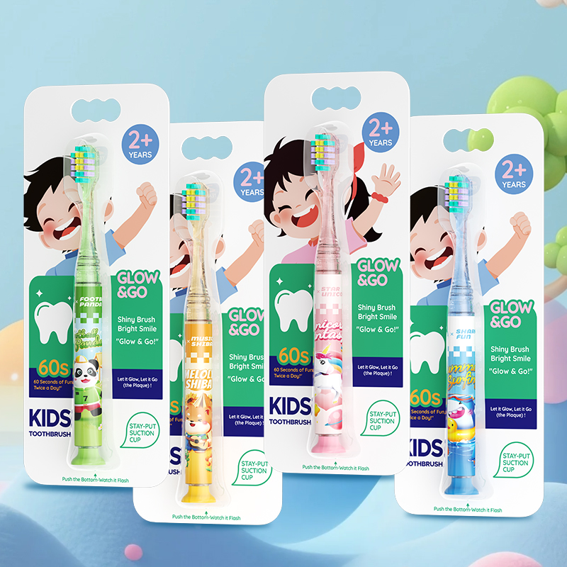 The toothbrush lights up for 60 seconds, providing a full one-minute brushing timer. This visual cue helps children learn proper brushing duration and develop a consistent routine. The LED timer makes brushing both effective and fun, encouraging children to brush on their own.